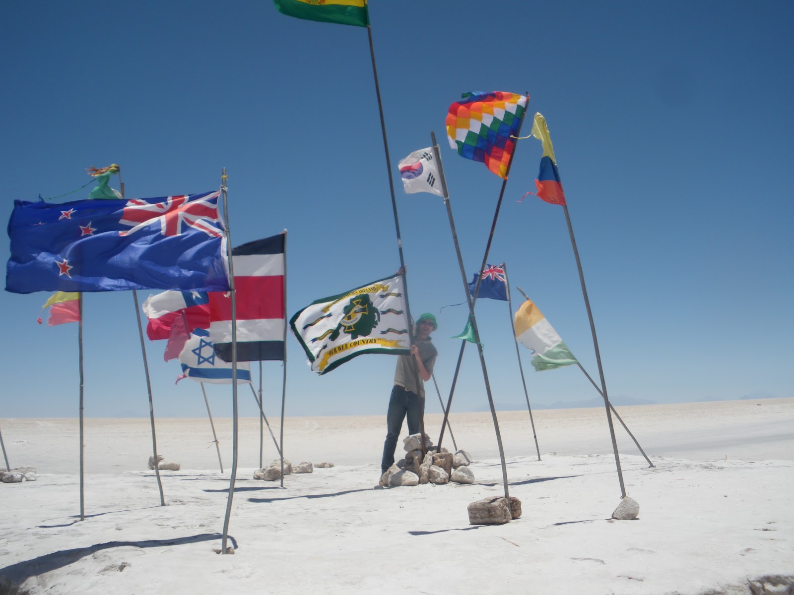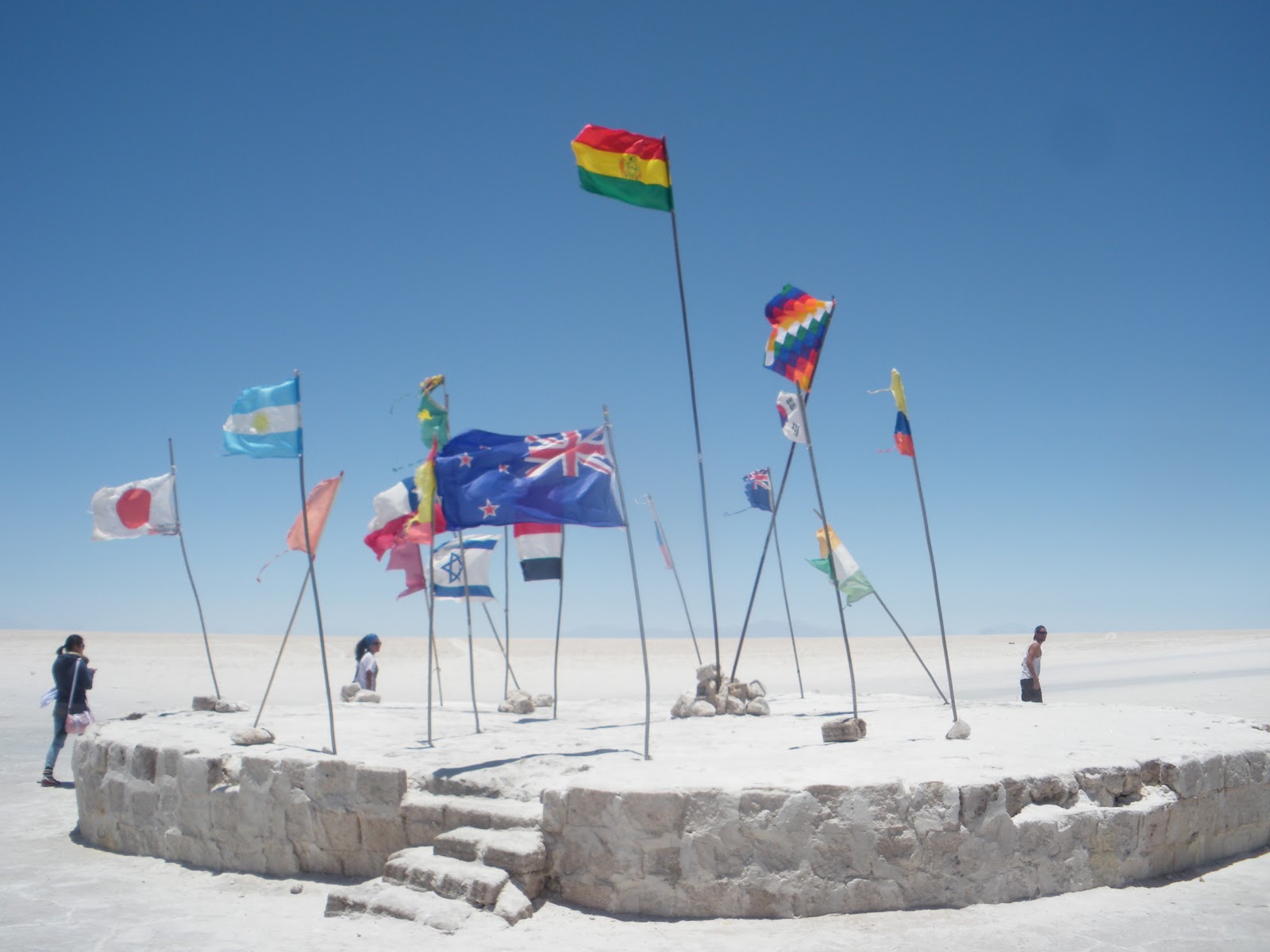 Hot, high up, salty, deserted, isolated but awe inspiring is how I would describe our arrival on the Uyuni Salt Plains – known as Salar de Uyuni. The town of Uyuni was left far behind, as was Cementario Des Trens and  Colchani Salt Village. We were now in a wilderness high high up in south western Bolivia. After seeing the salt for the first time at Colchani, we now arrived at what seems to be an international entrance (though unofficial) to the actual Salar de Uyuni. Arrival there I was feasted on a number of world flags, including New Zealand, South Korea, Costa Rica and Bolivia. Someone forgot to put a Northern Ireland flag there, so I whipped mine out and wrapped it round the flag pole for the most pleasing of photos. I had arrived at Salar de Uyuni. One of my “must sees” on my South America trip.