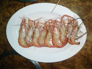 Eva was there but was just watching and taking the photos. She seemed happy to do that. It was exciting stuff. When one of our rods bent down towards the water, you knew a shrimp was chewing the bait and it was a case of choosing the right moment to pull your rod up, hoping the shrimp wouldn’t fall off. Hoping the shrimp was caught, Hoping the shrimp would make it into the fish net, which already contained quite a few shrimps. Ugly white and pink creatures these. I certainly had never seen or eaten one before. Soon I’d be doing both.