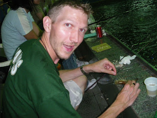 In total by the end we had 10 shrimps between 5 of us, but David had to shoot off home to his wife, so the 4 of us could share and cook the shrimps. Neil caught 2, David caught 2, Binh caught 5 and I was happy I had caught one. The shrimps were all still alive in the net, they survive a wee bit out of water. Then we placed them in a pot of jelly which kills them sadly. After this we got some silver strong skewers and put two of them through each shrimp ready to barbecue/grill them. A Taiwanese guy showed us how to do this, helped us and gave us an extra large extra shrimp for free for doing this.