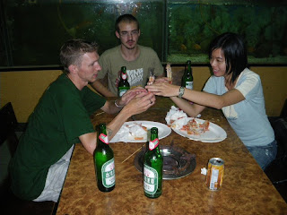As Neil and I sipped on beer we realised this was some kind of random night that would be remembered. I knew it was special. I had never really been fishing before, of any description and here we were fishing for Shrimps in the city of Shinying! Looking into the murky green water you could see the shrimps. The owner of the centre obviously fill the water up with shrimps to ensure we catch them. Where there were bubbles there were shrimps basically and we moved our rods accordingly.
