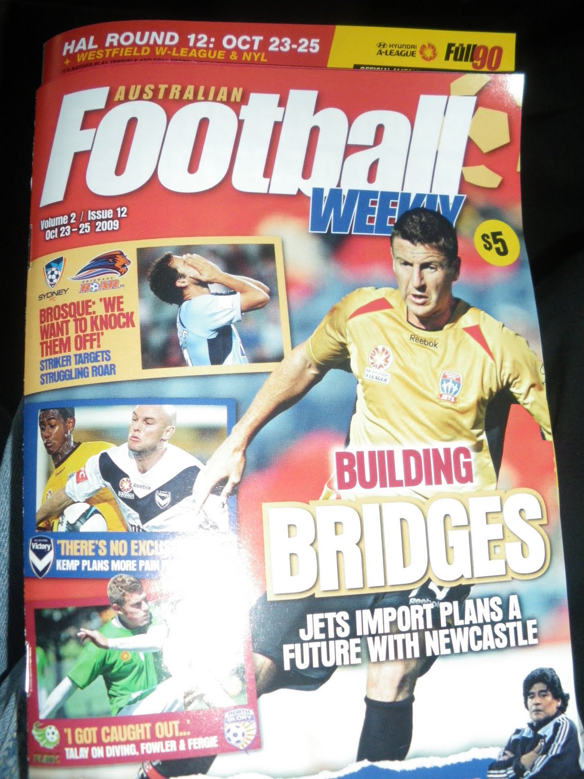 We bought a match programme each, they were 5 Dollars, and was more like two mini magazines. The first one featured that week of fixtures in the whole A-League, centring on the Sydney match. It was called Australian Football Weekly, and was Volume 2, Issue 12. Inside it was a magazine called The Full 90 which centred on the teams itself. They had the full details on each team in the league. I read them with interest, the league has just 10 teams: Newcastle United Jets, Central Coast Mariners, Melbourne Victory, Adelaide United, North Queensland Fury, Perth Glory, Wellington Phoenix, Gold Coast United, Sydney and Brisbane Roar. The star names as I could tell were Craig Moore (Brisbane Roar, ex-of Rangers), John Aloisi (Sydney, ex- of West Ham), Robbie Fowler (North Queensland Fury, ex- of Liverpool and Leeds United), Michael Bridges (Newcastle United Jets, ex- of Leeds United). It looked like an exciting league.