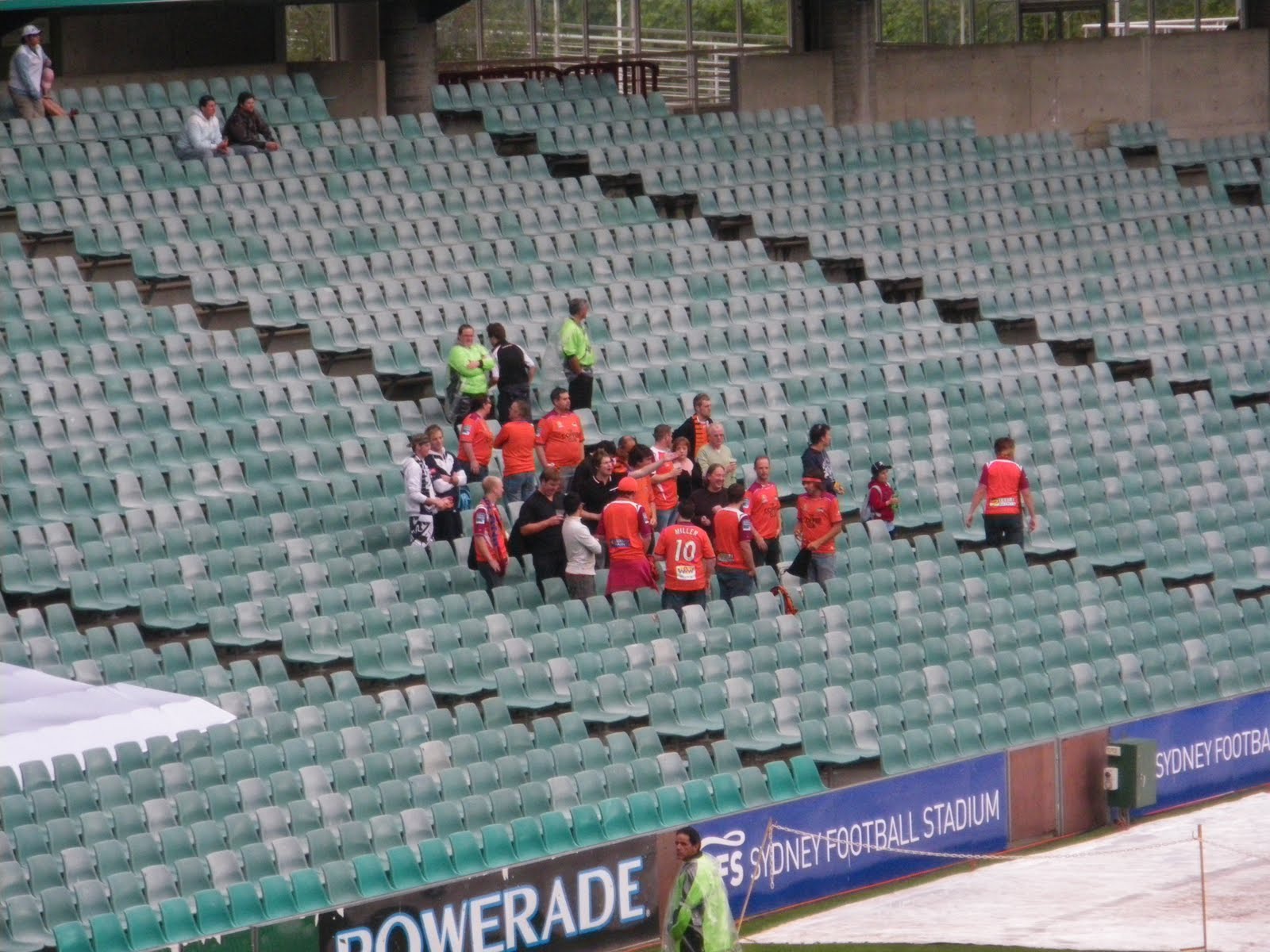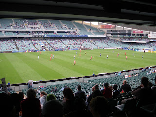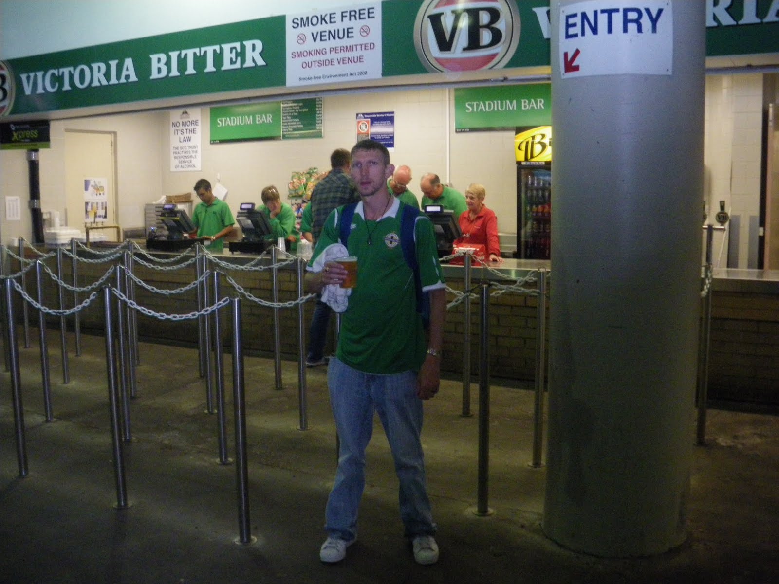 After the women’s match finished and I’d eaten my bacon and cheese rolls, we thought we’d have a beer. Its a novelty for a start being able to watch live football with a beer in your hand. You certainly cannot do that in Northern Ireland, or in England. Its banned and its illegal. But here in Australia, you can have a beer in the bar, out the back, or bring it to your seat if you go to the “alcohol permitted” areas. I had given up alcohol for 6 months during 2009, and to be honest I didn’t miss it and enjoyed my break from it. I’ll never drink alcohol on a crazy level ever again, but since travelling again, I’ve been prone to try a few different beers in each country or place. This time, inside Sydney Football Stadium, we had a Schooner of VB each. They were 5 Dollars each, the normal price, we expected that. With beers in hand we walked this time round to the other side of the stadium and sat down in the alcohol zone while the players were warming up for the big game.