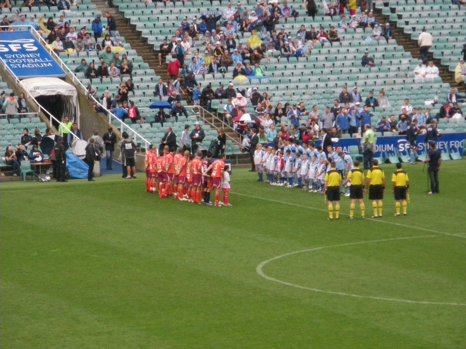 Brisbane played in orange, Sydney in sky blue. The match attendance looked low for such a big stadium, but was announced as 8,456 which was decent enough on a wet Sunday in late October. The stadium holds over 40,000. Of the fans there, the Sydney FC hardcore were all in sky blue with big flags behind one of the nets, in a reserved area. They did the bouncy a few times and were quite loud. Brisbane Roar had a low away turnout, a hardcore of less than 30 fans I’d have thought, but then it is a hell of a long way to travel to watch a football match. Australia ain’t exactly England. The Brisbane Orange Army were loud enough, and we thought of joining them for the second half. We did walk down towards their section behind the other nets, but decided just to stay on the Sydney home side, this time we watched the second half from the other side of the pitch.