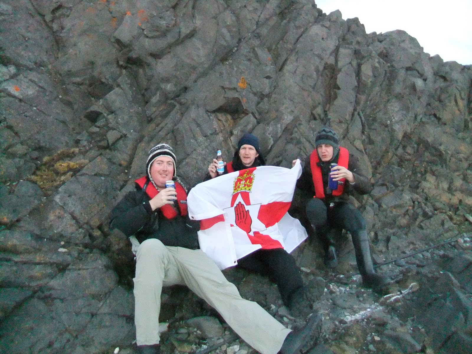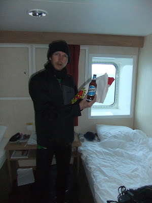 I got together a wee group for the drink. It consisted of Brazilian Rodrigo, Australians Mark, Russell and Ilise and Austrian Monika. That’s myself Russell and Rodrigo toasting to an excellent time in Antarctica with my Northern Ireland flag.