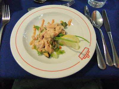 We had time to eat on the sailing down The Beagle Channel – I think it took about 2 hours. Starter on board – chilled Antarctic prawns of course.
