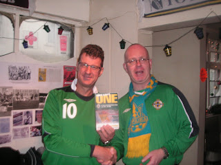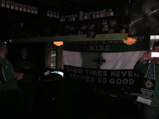 Firstly Graham Anderson turned up and immediately said “Jonny theres a Northern Ireland top up on the wall in here!” Of course I didn’t believe, or thought that maybe he had just put it up there, however a juke round the corner and there it was, a vintage 70s NI tap attached right to the ceiling (OK, not quite the wall) nestled beside a Sunderland tap. That was a nice surprise, as was getting mulled wine for £1 a glass. Total bargain. More and more SOENISC members came in, such as Shaun Schofield who brought his 7th Parnu NISC fleg with him and Jono Crute who was still only 17 at the time. A quick few photos in there were minced with the consumption of mulled wine and the joy on Millwall Neil’s face at seeing a Millwall FC scarf also up on the wall. We thanked the landlord for his hospitality and headed to the meeting venue at Finns, for the later time of 12 noon.