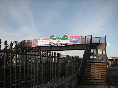 The train on the way from Waterloo – Southsea (Portsmouth Harbour) was where we met Scotland fan Ed Broussard, who was one of Tim Beattie’s mates (Tim being club treasurer of the SOENISC) and was joining us for the day for the craic! It was sure to be a mad one. I opened a tin of beer on the train and we had begun the drinking fest already. We’re Northern Irish. We drink beer. That’s what we do. I also opened my party bag which contained many and numerous green items which would assist in our changing of the colour of the island from Wight to Green for the day. OK, it’s not Wight as in colour white, but the jokes is lost on you if you don’t pretend it isn;t as funny as it is. These random items included a green sieve, a green and white “Santa Stop Here” sign (one month too early), green sunglasses, green feather dusters, green wigs and hats and many other things which you wouldn’t believe a supporters club chairman would bring to a meeting. For something to be unbelieveable, you have to make people believe it. Really. No really.
