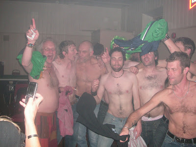As we continued to dominate proceedings in the wee club, we filled the dancefloor with green and the DJ played whatever hits we wanted, it even culminated with me joining Tim Beattie for an embarrassing duet of Take That’s “Back For Good.” Despite my closeness to Tim, I hope never to have his lipstick marks still on my coffee cup. Before this we had Owen’s mate Carlo on vocals singing “Don’t You Want Me Baby?” We all agreed that Carlo’s performance was indeed the best of the night, at least he could sing a bit. A few songs later and we were doing a “gay disco” in the club. If you check the photos on this blog post, you will notice how many NON – SOENISC members actually got their kit off for the “Gay Disco.” A shocking amount of testosterone was on view for those Cowes ladies lurking nearby. Even Ed “Colin Murray” Gladdis got his top off. I think this was probably the beginning of the end for the “gay disco” within SOENISC, it really isn’t healthy or cool any more. Soon we noticed that the host himself Alex IOW Army Higgins had called it a night as he had overdosed on the old booze like the resty us.
