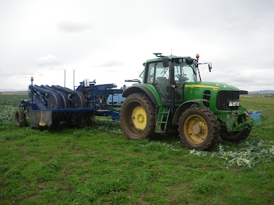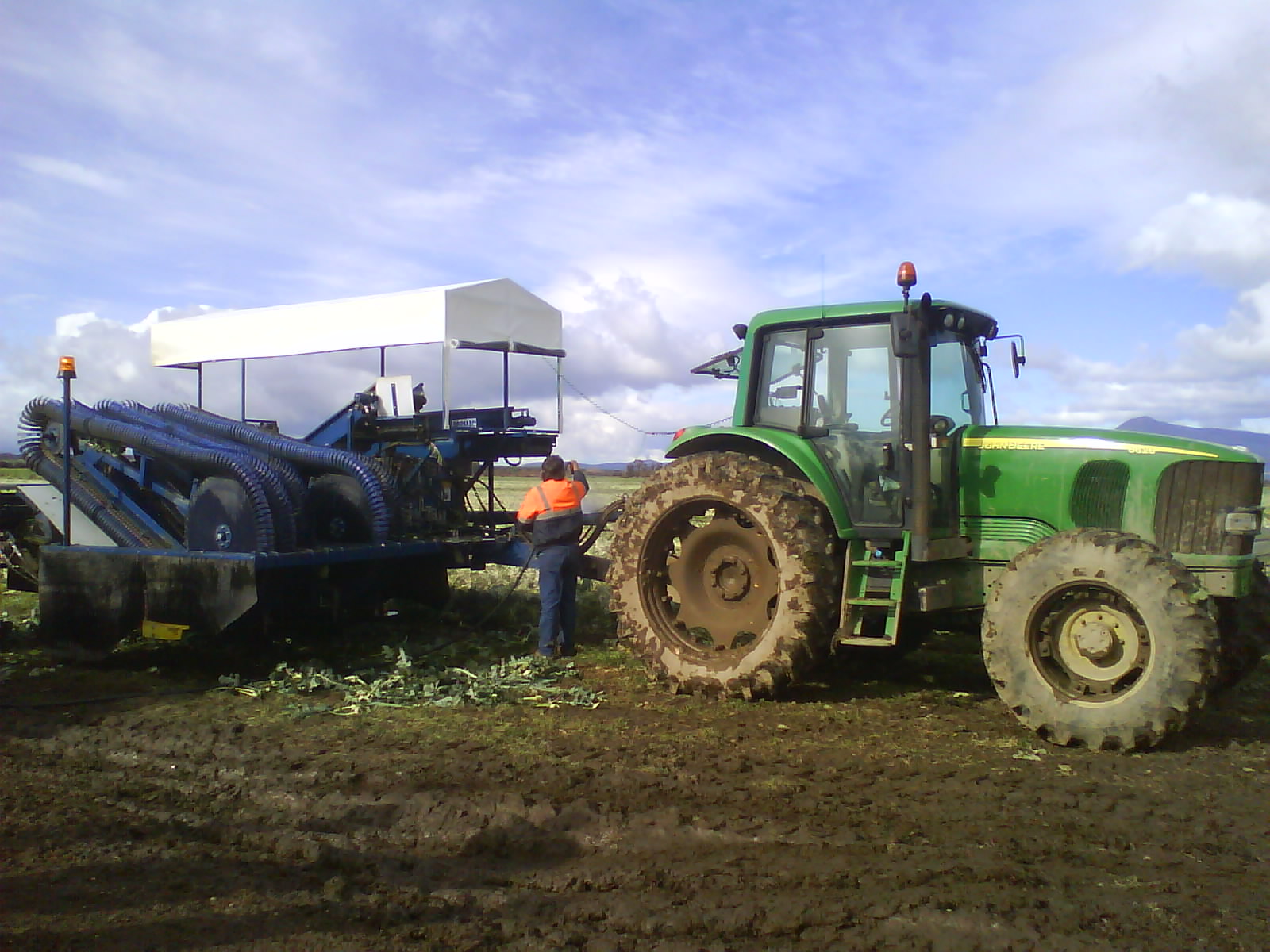 On the broccoli harvester basically it requires to be connected to the back of a tractor and the harvester itself spans across 6 rows of broccoli, known as 2 beds. However only one of these beds, and therefore 3 rows is included in the actual span of the harvester blades and pick up carousels. This is ideal. Any more and the staff couldn’t cope, nor would there have been room for any more staff.