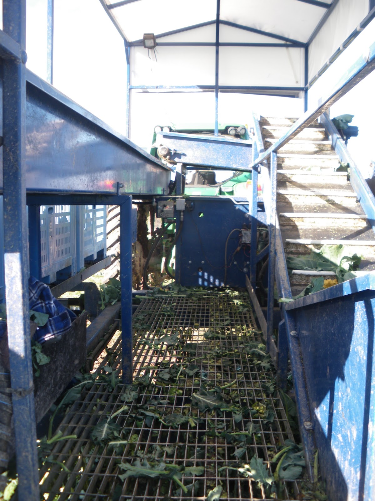 There was room for 5 on board but this often meant that one person would have to be on the back, basically hanging on the back of the harvester! At first this was quite novel, but quickly became the most hated part of the job as your time would be spent separating the good from the bad, being hit by flying leaves and in the words of my colleague Zac “it’s too windy” – indeed though it wasnt wind – it was the gust from the vents that would only lift and make the light stuff fly away – very clever which meant that in theory only the heavy bits would continue onto the belt – i.e. the broccoli.