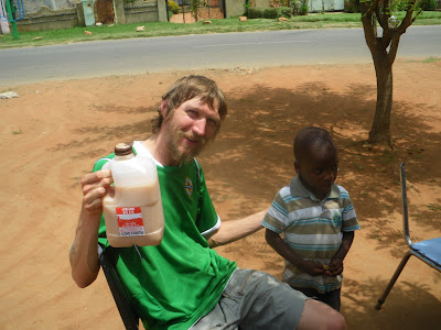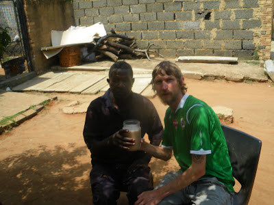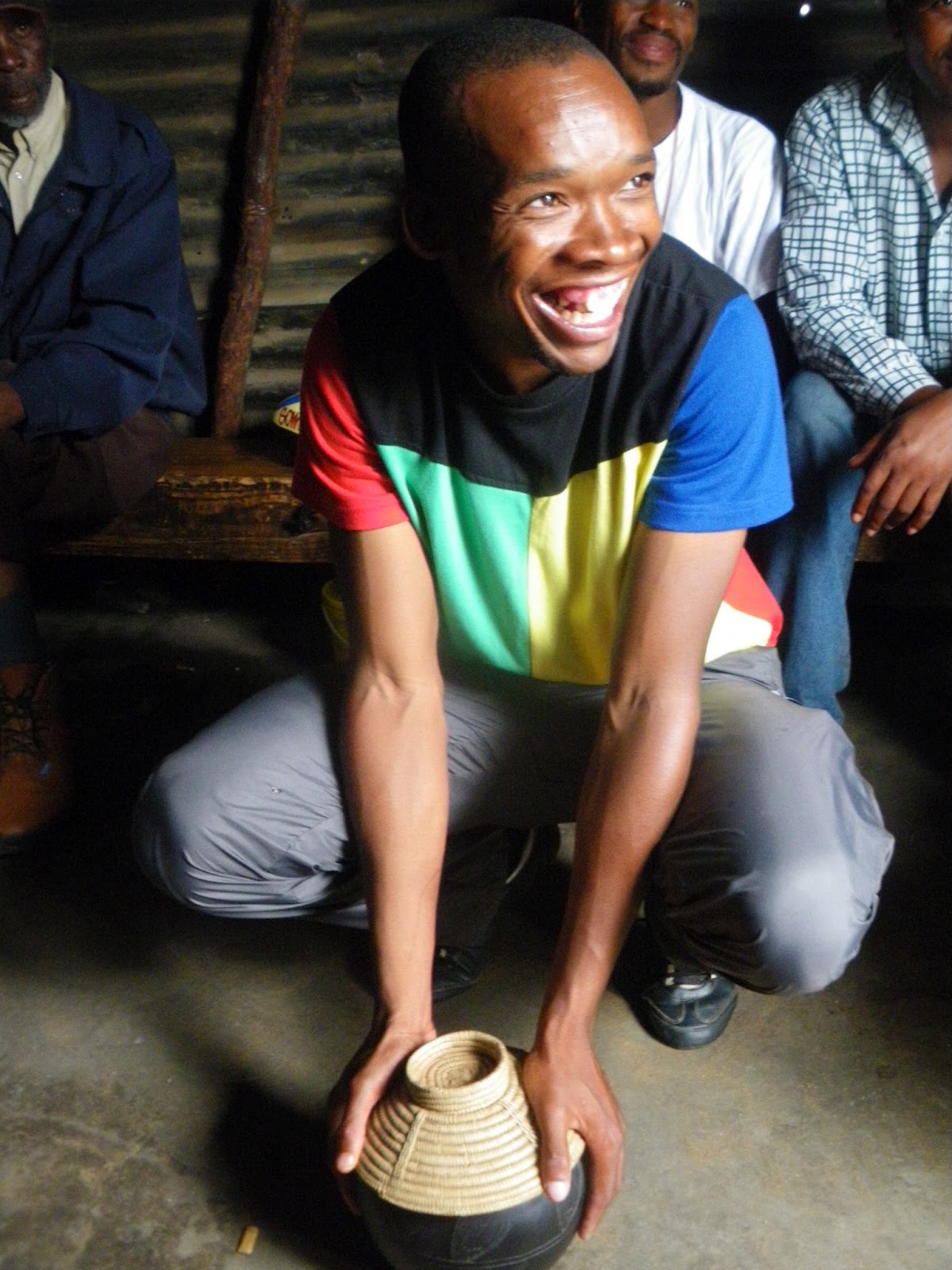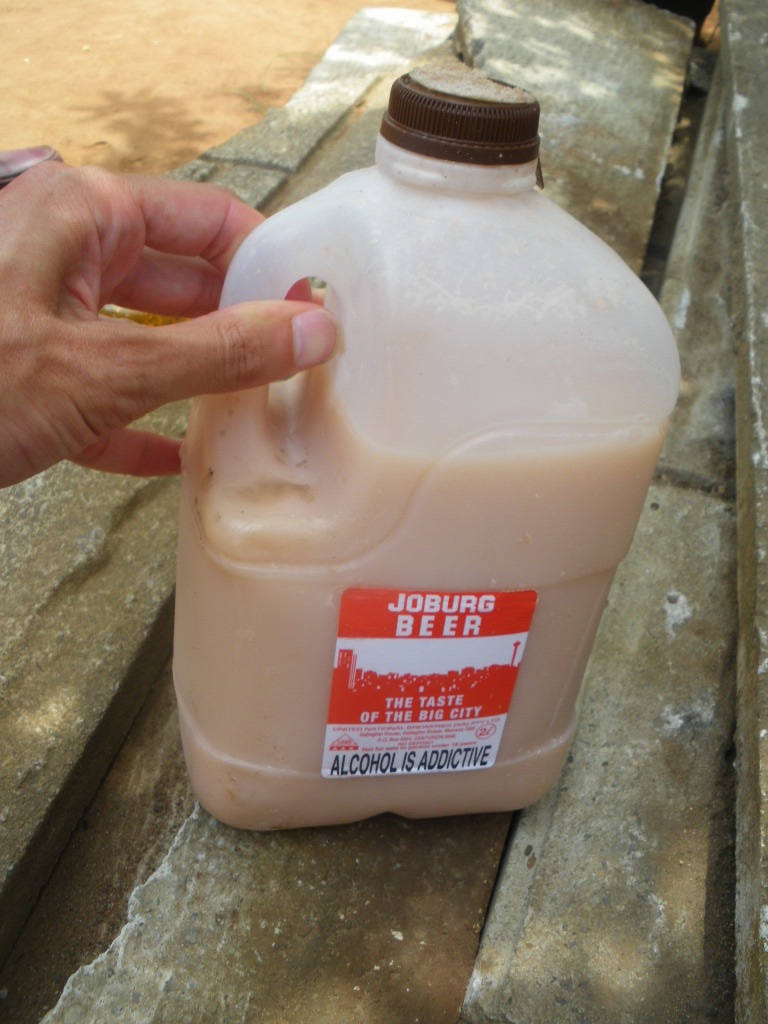 Solomon gets us to buy a bucket between us to share with everyone. It’s a black odd shaped bucket with a straw lid. Inside is the pinky beer. Commonly known and packaged as “Joburg Beer: The taste of the big city” but known to the locals as “oom gom boat ay” (at least that spelling helped me pronounce it properly).