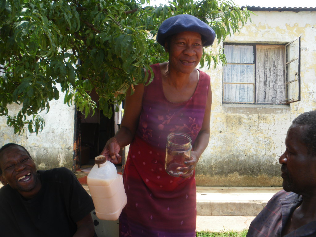 The beer is normally communal. In Soweto it is often Johannesburg Beer, which comes in milk cartons, has a pinky opaque colour and is very cheap. From the sealed milk cartons, it is then poured into buckets (white, clear or black) for communal consumption.