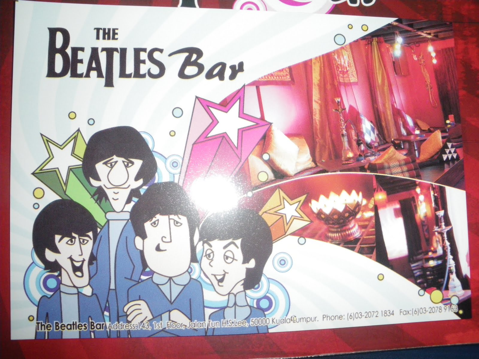 Its amazing you know where and how you find things. This one was random – I found a “Beatles Bar” slap bang in the city centre of Kuala Lumpur, Malaysia! It was by chance. I mentioned before how English traveler Niki Whitley spent a day with Natalja and I and helped us firstly by loaning me her Lonely Planet book and secondly by helping us find a hostel. From her book, I chose randomly the “Wheeler’s Hostel”, probably only because Tim Wheeler is the lead singer of Northern Irish band Ash.
