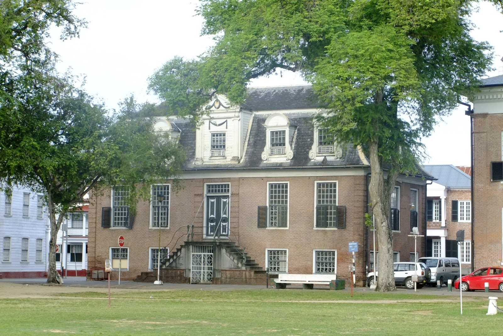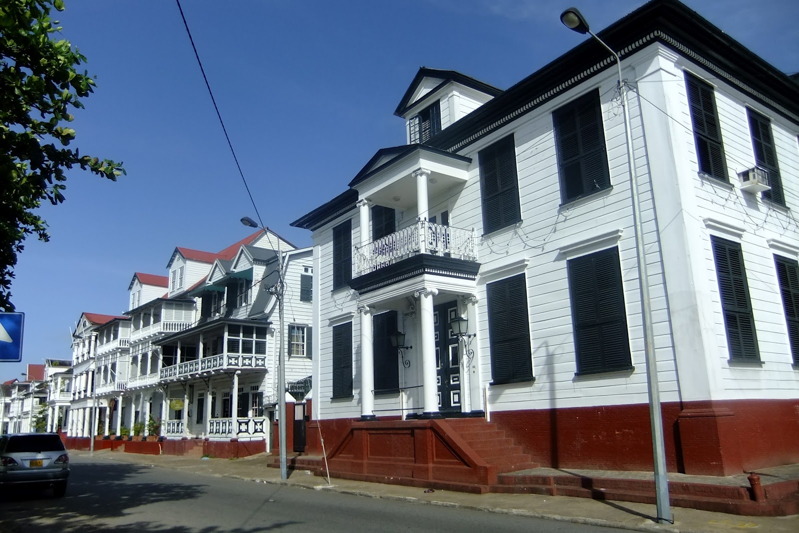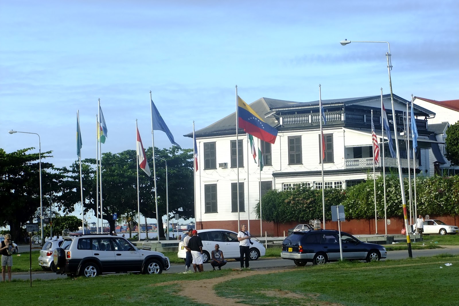 The backdrop for this melarkey is the Suriname National Presidential Palace. While I’m at it, I might as well detail the actual buildings at Onafhankelijkheidsplein, as it’s the city’s central square. So you’ve got the Presidential Palace, the statues of Johann Pengel and Jagernath Lachmon, the National Assembly, the Ministry of Finance, Fort Zeelandia and The Palmentium. Plus nearby it all leads on Waterkaant Street – a famous UNESCO World Heritage street of typically old Dutch buildings.