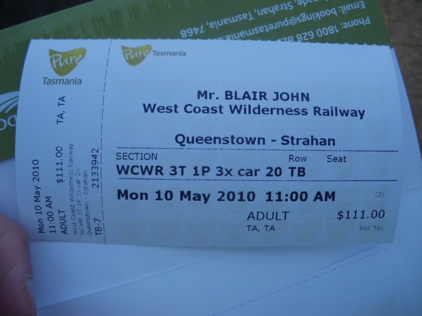I had made my booking the day before, and was actually quite lucky. I literally had just this one day to do the train journey and they had a few seats left. It’s wasn’t cheap – but then it was to be some experience and a once in a lifetime opportunity so it had to be paid for. The cost was $129 all in which included a coach journey from Strahan to Queenstown, some time in Queenstown, and a 5.5 hour train journey back with many stops and surprises along the way including a full lunch. I was excited when I got my reservation paper from the tourist office. It was just a white sheet of paper with black writing on it. I had to exchange that for my train and coach ticket the morning of the trip.